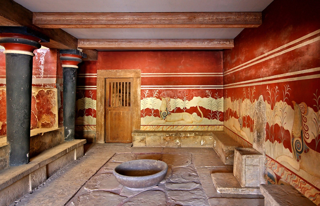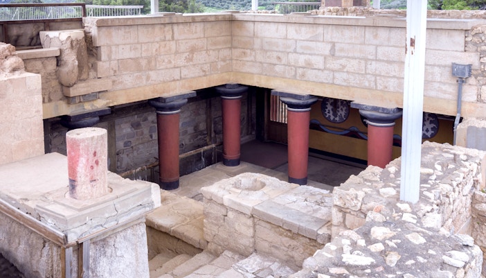 - Lustral basin: Just south of the Throne Room, connected through a small doorway, is a sunken area known as the ‘lustral basin’. It’s a shallow, plaster-lined rectangular depression with steps, likely used for ritual washing.